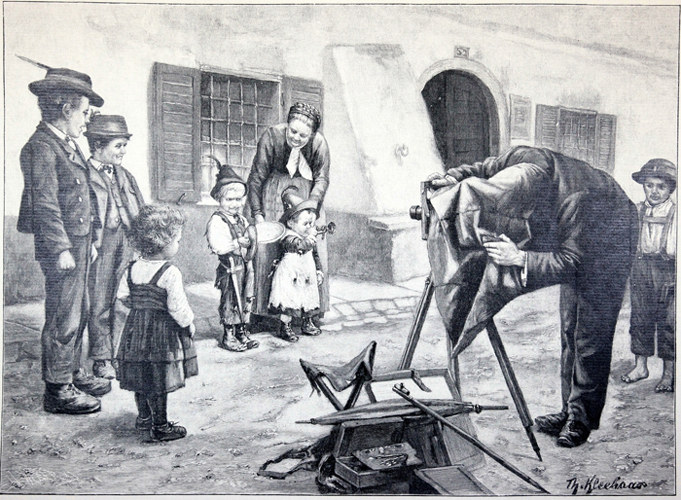 Dotarłem do bardzo pięknej grafiki, wykonanej w drugiej połowie XIX wieku. Mimo częściowo czytelnej sygnatury, nie mogę jej odczytać w całości i tym samym nic nie wiem o autorze tej grafiki. Przedstawiona sytuacja dokładnie pokazuje wyposażenie wędrownego fotografa i sposób jego pracy. Proszę zwrócić uwagę na świąteczne stroje oraz obuwie fotografowanych osób i strój codzienny chłopca stojącego za fotografem, przypatrującego się jego pracy. Różnica w ubiorze jest ogromna. Moja znajoma kupiła niedawno na Allegro reprint tej grafiki za 35.- zł.